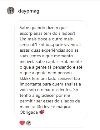 Sabe quando dizem que escorpianas tem dois lados?! Um mais doce e outro mais sensual?! Então….pude vivenciar essas duas experiências sob as suas lentes e que momento incrível. Sabe captar exatamente o que a gente tá pensando e até o que a gente nem pensou kkkkk tem um lado sensível tão importante para quem analisa a vida sob o olhar das lentes. Só tenho a agradecer por me permitir ser esses dois lados de maneira tão leve e mágica. Obrigada 💕